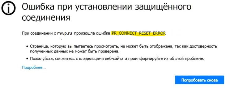 Помилка під час встановлення захищеного з’єднання PR CONNECT RESET ERROR з’являється у браузері Firefox під час відвідування сайтів.