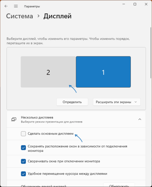 - Відкрити параметри екрана та вибрати інший екран як основний: натиснути на екрані та встановити позначку «Зробити основним дисплеєм». Після цього всі програми, що запускаються, будуть відкриватися на ньому.