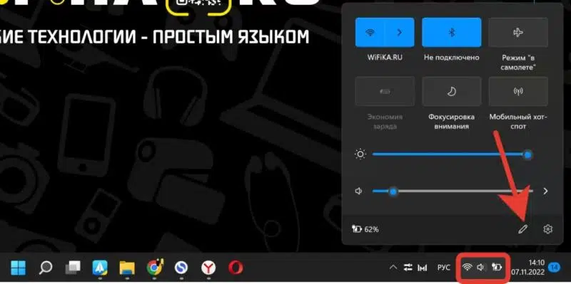 - Тиснемо на ноутбуці в нижній панелі значки на wifi значок. Відкриється меню швидкого доступу до різних функцій, але бездротовий дисплей тут за замовчуванням немає. Щоб додати його, потрібно натиснути на іконку у вигляді олівця